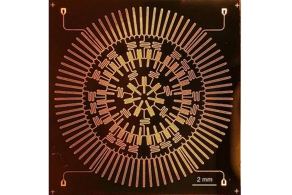 Hyperbolic lattice formed from a set of coupled superconducting coplanar waveguide cavities.