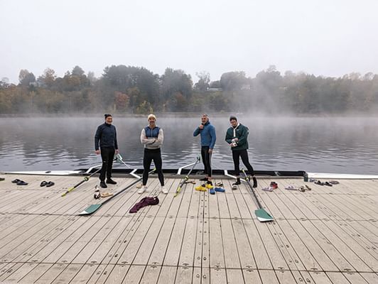 Engineering sciences major Jeremy Howick ’92, part of the Dartmouth heavyweight crew that won the 1992 Eastern Sprints, recently reunited with three of his original teammates and coach Scott Armstrong for the world’s biggest race, the Head of the Charles Regatta. Howick, Dave Dragseth ’93, Sohier Hall ’92, and Elad Levy ’93 sought a better finish than their ill-fated ’91 attempt at the Boston regatta, when they crashed into the last bridge. Last October, the four-man crew tuned up in Hanover before heading to Boston a week later to finish 11th in the men’s senior masters fours (50-plus). They raced as part of the Ever Green Boat Club—the College alumni rowing club—which included 41 men and women from 1979 through 2024 competing in six boats. “Scott Armstrong taught us to dream very big, then outwork anyone else,” says Howick, who sees parallels between his athletic and professional pursuits as director of the Leicester Medical School Stoneygate Centre for Empathic Healthcare in the United Kingdom. “To succeed as the director of the centre, I’ve had to break new ground in the medical school, which has required me to be bold in my ambitions and vision and have a tireless work ethic to follow through.”