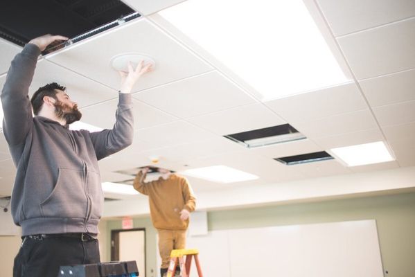 Classroom Technology Services integrator Jason McDonough installs a ceiling tile equipped with a speaker in Silsby, part of a campuswide effort to refresh the technology in classrooms. (Photo by Katie Lenhart)