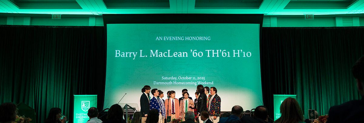 The celebration, held over Dartmouth's Homecoming weekend, drew former engineering deans, faculty, and university leaders, including Susan Wright, wife of the late President James Wright, with whom MacLean had served as a Dartmouth Trustee from 1990 to 2000. The evening also included a performance by the Dartmouth Aires and tributes from Thayer board member Charles E. Nearburg '72 Th'73 Th'74 and past board chair Samantha Scollard Truex '92 Th'93 Tu'95.