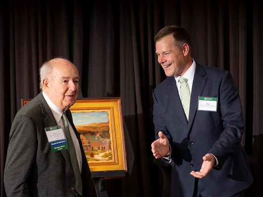 MacLean (left), with Van Citters, was presented with a painting by local artist Doug Henry of Thayer's new expanded buildings.