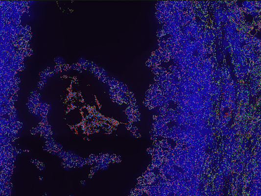 Composite image of an ovarian follicle with an oocyte in the center, showing expression of genes (each spot) in cells (stained blue). (Image by Rhea Sharma and Ruixu (Rachel) Huang)
