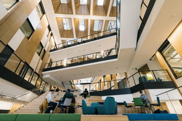 The Class of 1982 ECSC features more than a dozen classrooms and instructional labs able to accommodate 400 students, more than 80 faculty offices, and a variety of labs — all ringing a central light-filled atrium. Including the 340-vehicle parking garage under the academic spaces, it is the largest construction project in Dartmouth history.