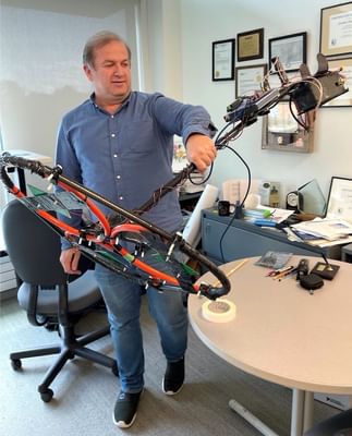 Shubitidze holds a handheld advanced electromagnetic induction sensor array he and his group built at Dartmouth for detecting, mapping and identifying underground explosive hazards and metallic infrastructures.