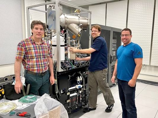 Maxime Guinel de France, left, and Thermo Fisher Scientific engineers Patrick Dean and Luke Metraw install the new electron microscope. (Photo by Catha Mayor)