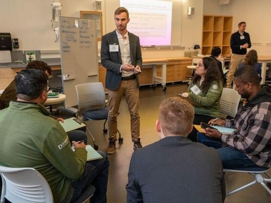 The educational programming is virtual, so groups can join from any location, but those who choose to work in Hanover—and seven out of the nine teams do have close affiliations with Dartmouth—may use work and lab space in the Irving Institute building. Areas of focus in Greenshot's inaugural cohort range from low emissions regional air transport to a wood-based alternative to sheetrock.