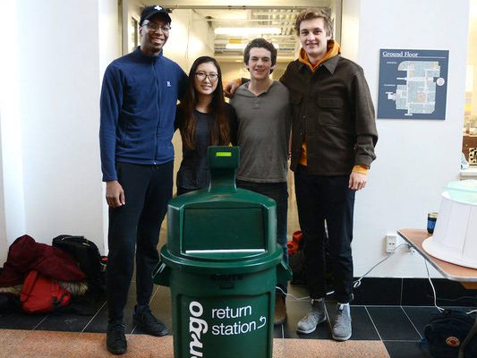 In 2019, Max Holden '22 (far left) and team won the Jackson Award for best overall performance in ENGS 21: Introduction to Engineering for their design of a "Green2Go Recycle Station" — a unit for the convenient return of used Green2Go food containers. (Photo by Kathryn Lapierre)