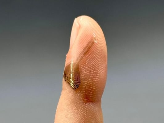 Thin-film, bioelectronic device constructed at Dartmouth's Regenerative Bioelectronics Lab using the protocol. (Photo courtesy of PhD Innovation Program student, Jonathan Pelusi.)