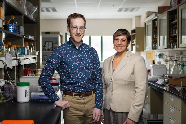 Matthew Slein, a PhD candidate in the Leib and Ackerman labs, and Iara Backes, an MD-PhD student at Geisel, served as co-first authors on the study. (Photo by Rob Strong)