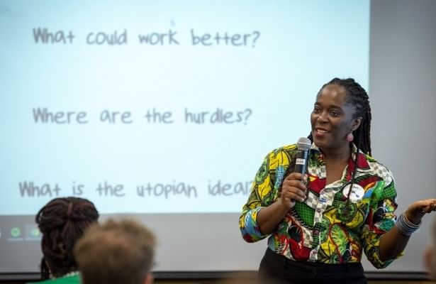 Anaissie's session, "(Re)Design for Liberation," dissected elements of design thinking that uphold injustice, and asked participants to consider a rebuilt design approach rooted in liberation values. The 50 students, faculty, and staff who attended engaged with the mindsets and modes of liberatory design using the "Liberatory Design Deck," a tool designed by Anaissie and collaborators to promote the habits and conditions necessary for justice and equality. Liberatory Design is the result of a collaboration between Tania Anaissie, David Clifford, Susie Wise, and the National Equity Project (Victor Cary and Tom Malarkey).