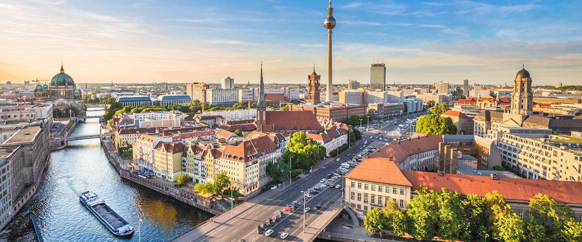 Aerial view of Berlin skyline with the TV tower and Spree river in Germany. (Photo by bluejayphoto)