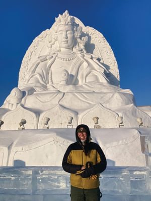 Michelle Wang ’21 Th’22 Th’23 visits the sculptures at the Harbin Ice and Snow Festival.