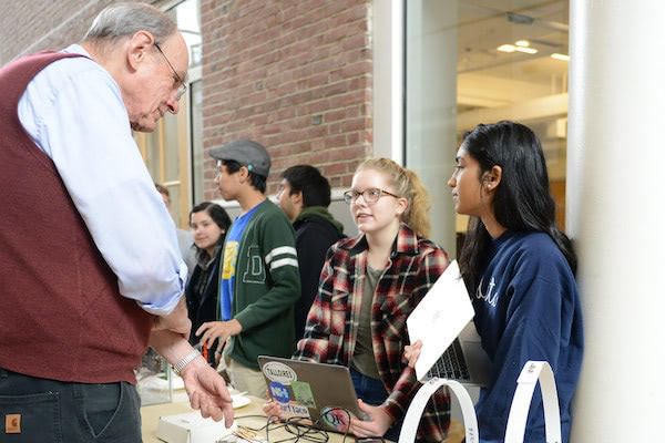 Professor Frost talks with students in Introduction to Engineering about their project prototype. (Photo by Kathryn Lapierre)